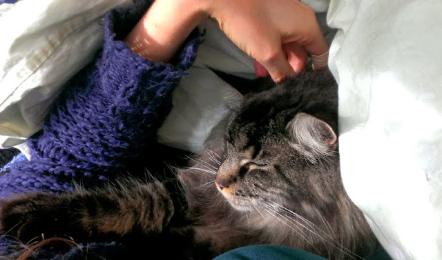 Det er i hvert fald rigtig rart. At sidde eller ligge og nusse med en spindende og blød kat, når man ikke har det så godt. Naturligvis også når man har det godt. Det har i hvert fald altid været en trøstende ting for mig, lige fra jeg var barn. Phoebe er rigtig god til den slags, og hun kom selv op til mig i dag for at putte.