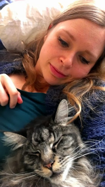 Jeg har ikke sovet ret meget de sidste døgn, så jeg har svært ved at hænge sammen efterhånden. Christian har det på samme måde. Vi fik heller ikke spist meget i går pga. hele situationen. Jeg har prøvet at hvile mig lidt på sofaen i eftermiddag, men har ikke rigtigt ro til at sove. Fik på et tidspunkt besøg af Phoebe, der gravede sig ind under dynen og op til min arm, hvor hun puttede sig. Rigtig hyggeligt. Hun lå rigtigt og krammede min arm og spandt. Det er en god trøst at ligge og nusse hende. Jeg har hende også jævnligt oppe i sengen om natten til en kæletur, når jeg ikke har det så godt. Hun sover altid for fodenden af min seng på gulvet, og vil gerne op, hvis jeg inviterer. Så kaster hun sig ind til mig og pipper, til jeg nusser hende nok. Jeg havde telefonen ved siden af os i dag, da vi lå på sofaen og fangede billeder her i indlægget. Desværre blev hun ikke liggende så længe, for der var for varmt under dynen. Men måske har hun tid til mig igen senere :)